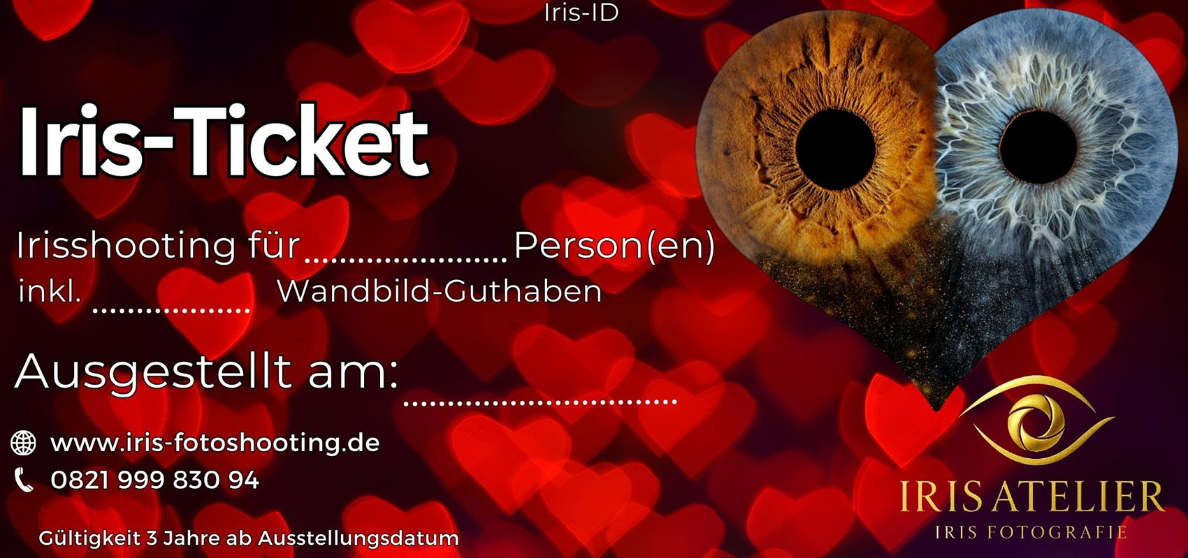 Dein persönliches Iris-Ticket – inkl. Wandbild-Guthaben Schenke unvergessliche Momente oder nutze das Ticket einfach für dich selbst! Deine Iris wird zum Kunstwerk – fotografiert im Atelier, von Hand retuschiert und als Wandbild in Galerie-Qualität umgesetzt.